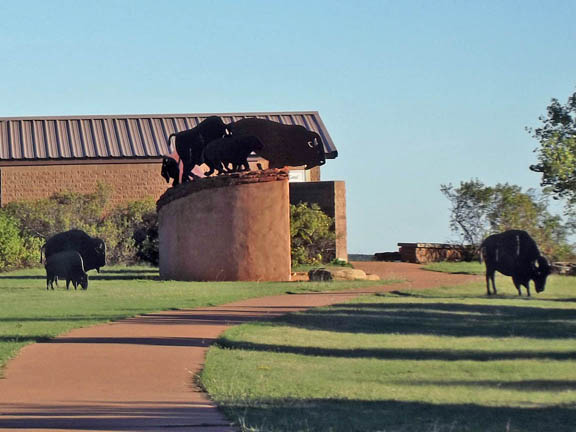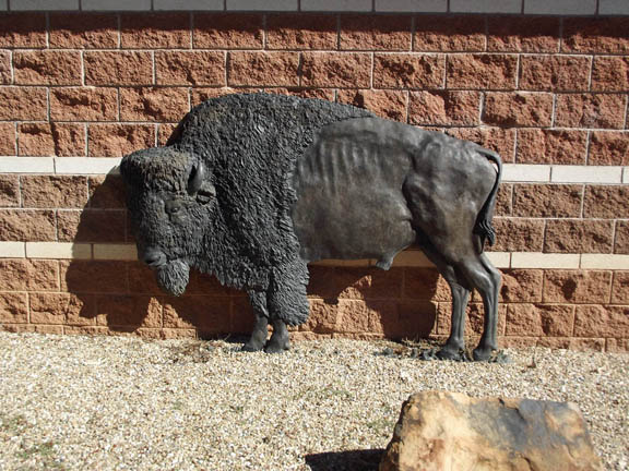 Metal buffalo sculpture near a small amphitheater. Do buffalo jump off cliffs?