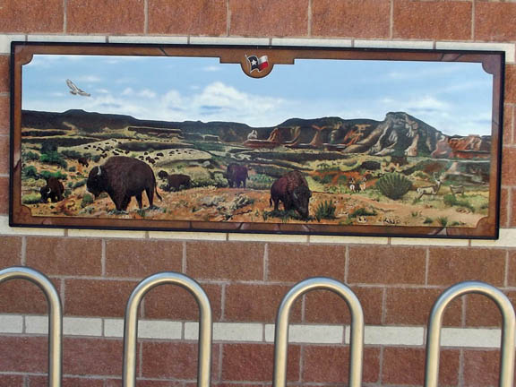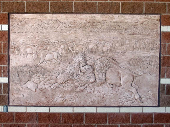 Relief art mural of a buffalo fight near the Visitor's Center Entrance.